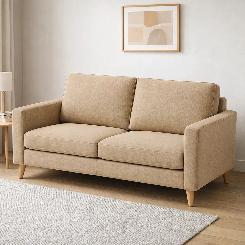 Bequemes 2-Sitzer Sofa – Stoff & Holz, Beige